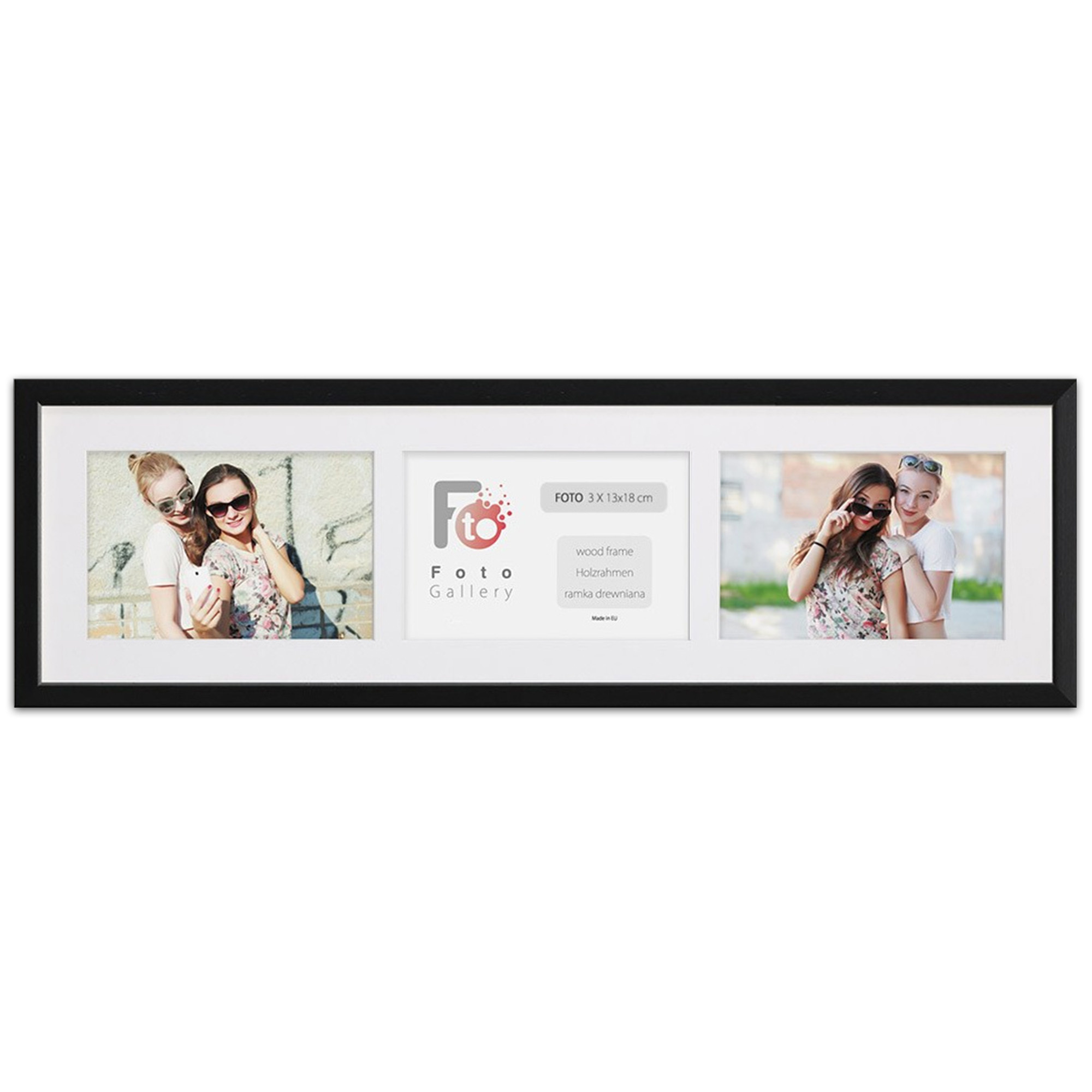 Nowoczesna, prosta w formie w 100% drewniana foto galeria w czarnym kolorze o przekroju profilu ramy 20x13 mm. Doskonała propozycja do oprawy kilku zdjęć w jednej ramie. Foto galeria wyposażona jest w jasne passe partout które pozwala na umieszczenie 3 fotografii w rozmiarze 13x18. Ramka drewniana wykonana jest z drewna sosnowego lakierowana w czarnym kolorze. Foto galeria Black 18x66 dostępna jest również w innych kolorach: białym, czarnym i naturalnym.