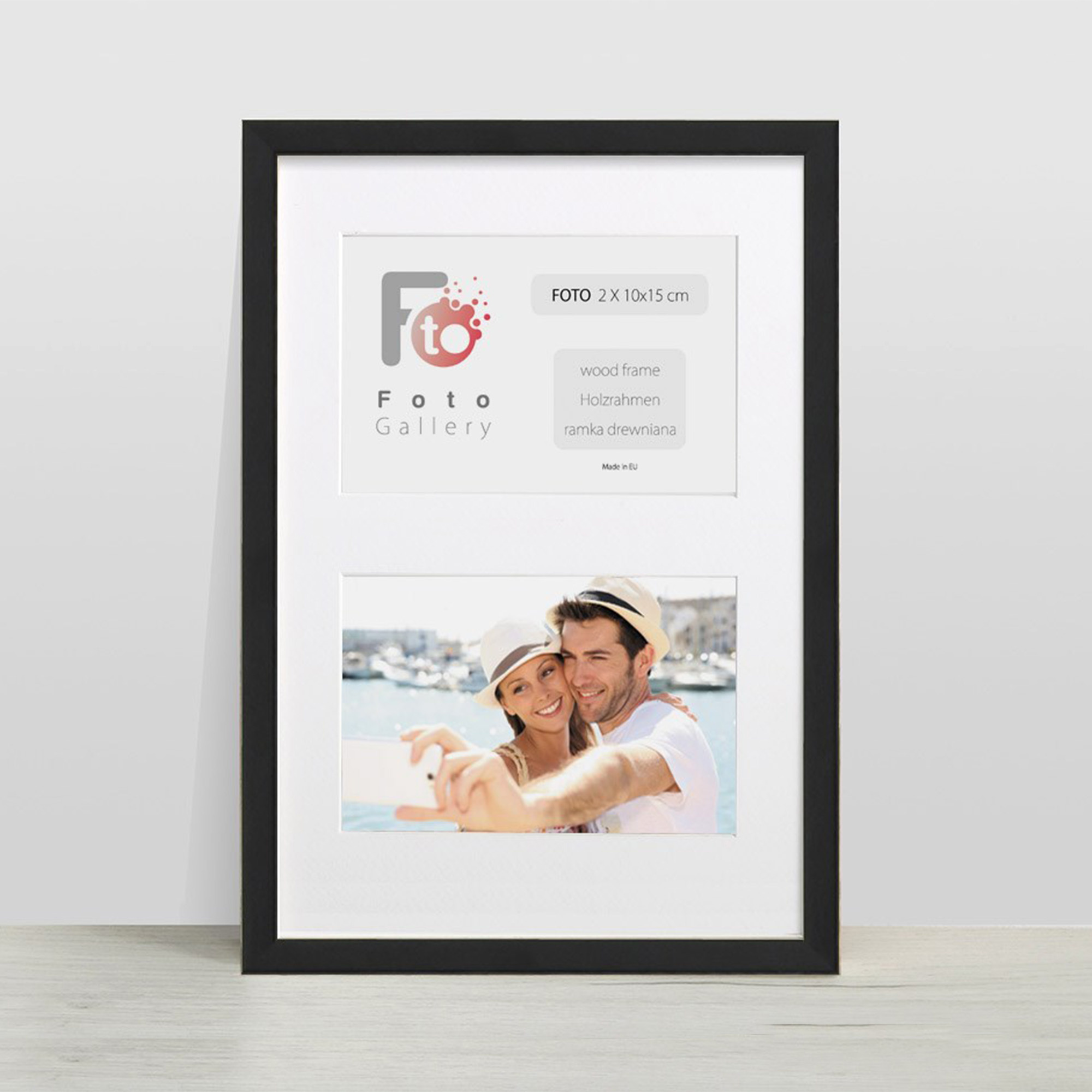 Nowoczesna, prosta w formie w 100% drewniana foto galeria w czarnym kolorze o przekroju profilu ramy 20x13 mm. Doskonała propozycja do oprawy kilku zdjęć w jednej ramie. Foto galeria wyposażona jest w jasne passe partout które pozwala na umieszczenie 2 fotografii w rozmiarze 10x15. Ramka drewniana wykonana jest z drewna sosnowego lakierowana w czarnym kolorze. Foto galeria Black 20x27 dostępna jest również w innych kolorach: białym, czarnym i naturalnym.