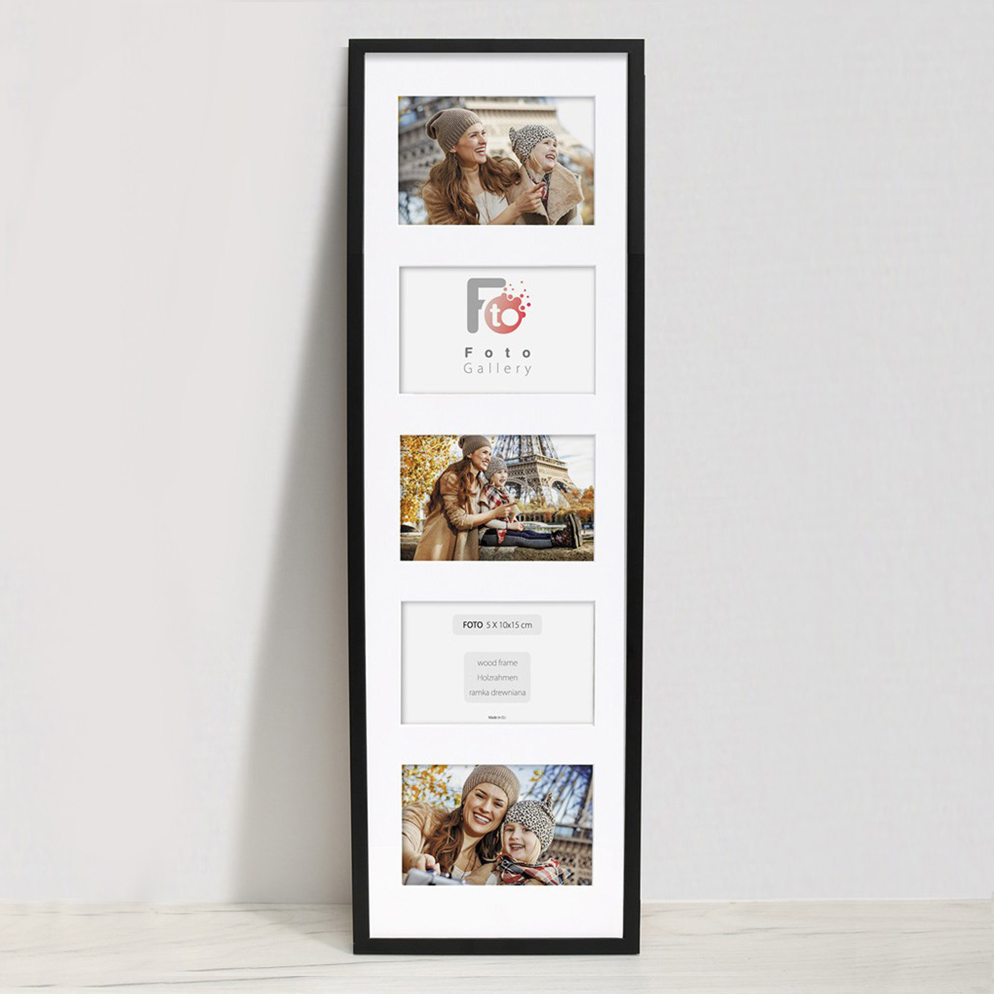 Nowoczesna, prosta w formie w 100% drewniana foto galeria w czarnym kolorze o przekroju profilu ramy 20x13 mm. Doskonała propozycja do oprawy kilku zdjęć w jednej ramie. Foto galeria wyposażona jest w jasne passe partout które pozwala na umieszczenie 5 fotografii w rozmiarze 10x15. Ramka drewniana wykonana jest z drewna sosnowego lakierowana w czarnym kolorze. Foto galeria Black 20x68 dostępna jest również w innych kolorach: białym, czarnym i naturalnym.