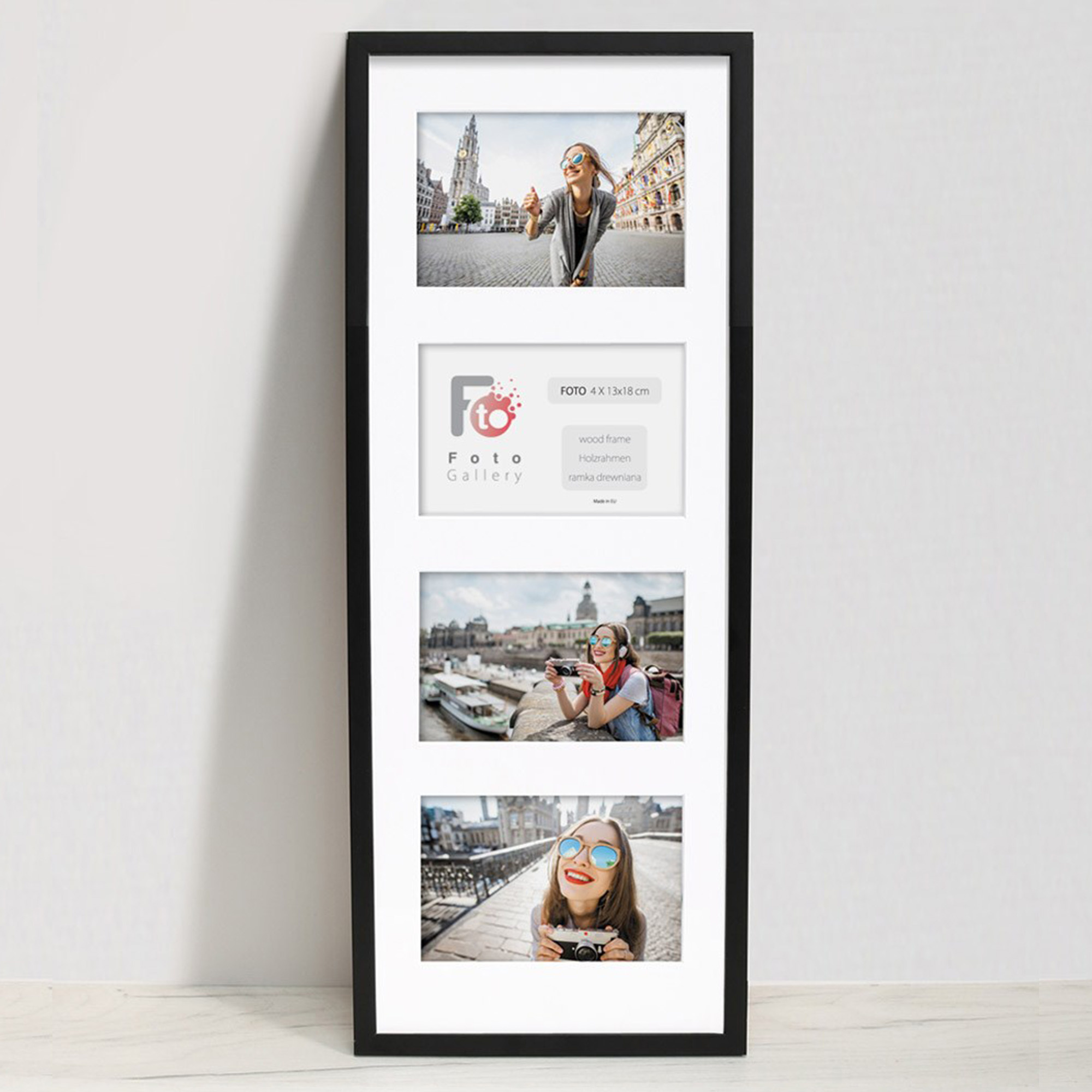 Nowoczesna, prosta w formie w 100% drewniana foto galeria w czarnym kolorze o przekroju profilu ramy 20x13 mm. Doskonała propozycja do oprawy kilku zdjęć w jednej ramie. Foto galeria wyposażona jest w jasne passe partout które pozwala na umieszczenie 4 fotografii w rozmiarze 13x18. Ramka drewniana wykonana jest z drewna sosnowego lakierowana w czarnym kolorze. Foto galeria Black 23x66 dostępna jest również w innych kolorach: białym, czarnym i naturalnym.