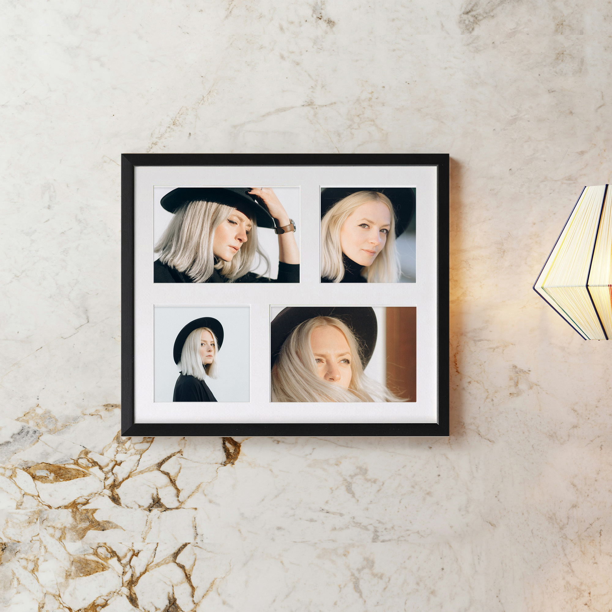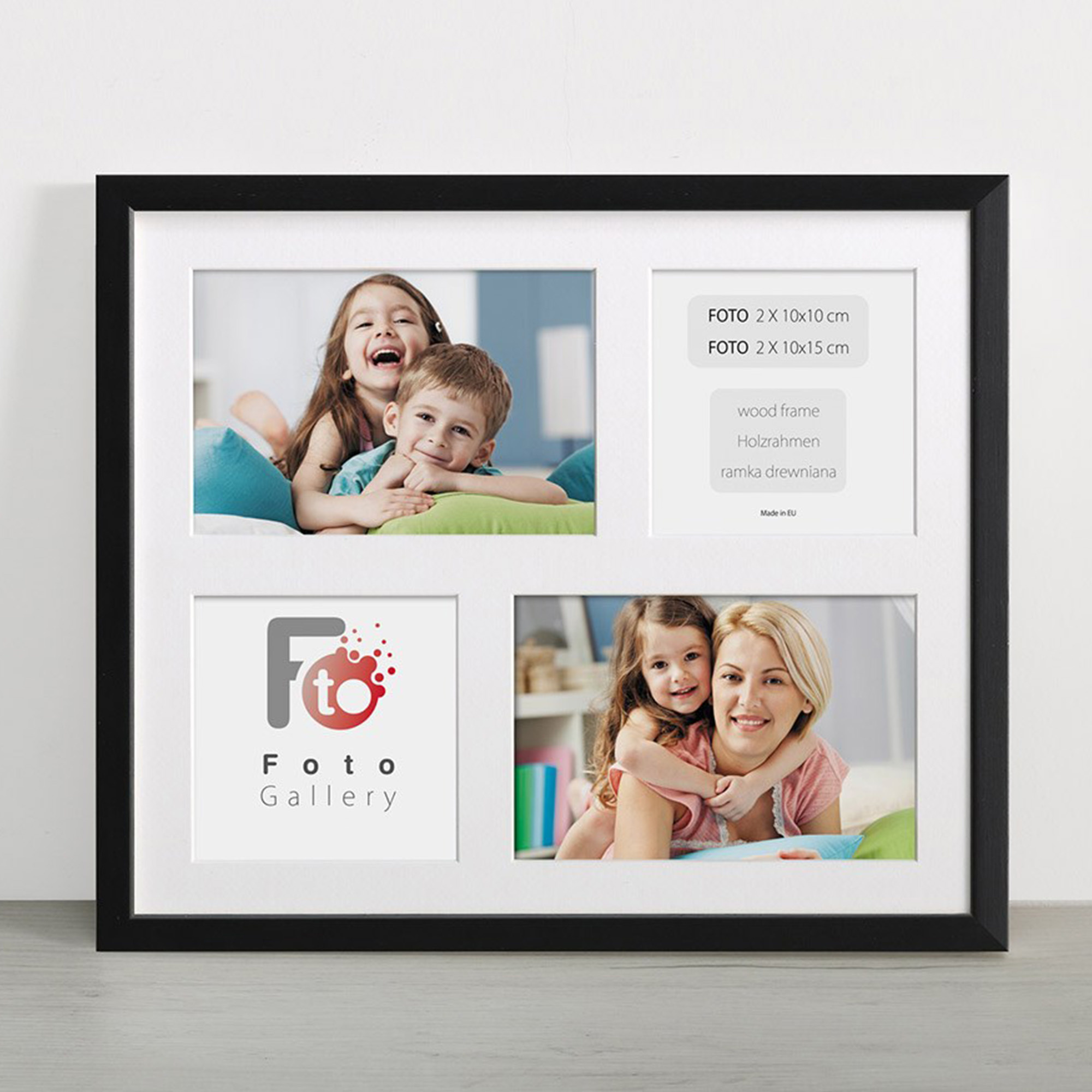 Nowoczesna, prosta w formie w 100% drewniana foto galeria w czarnym kolorze o przekroju profilu ramy 20x13 mm. Doskonała propozycja do oprawy kilku zdjęć w jednej ramie. Foto galeria wyposażona jest w jasne passe partout które pozwala na umieszczenie 4 fotografii w rozmiarze 2 x 10x10, 2 x 10x15. Ramka drewniana wykonana jest z drewna sosnowego lakierowana w czarnym kolorze. Foto galeria Black 26x31 dostępna jest również w innych kolorach: białym, czarnym i naturalnym.