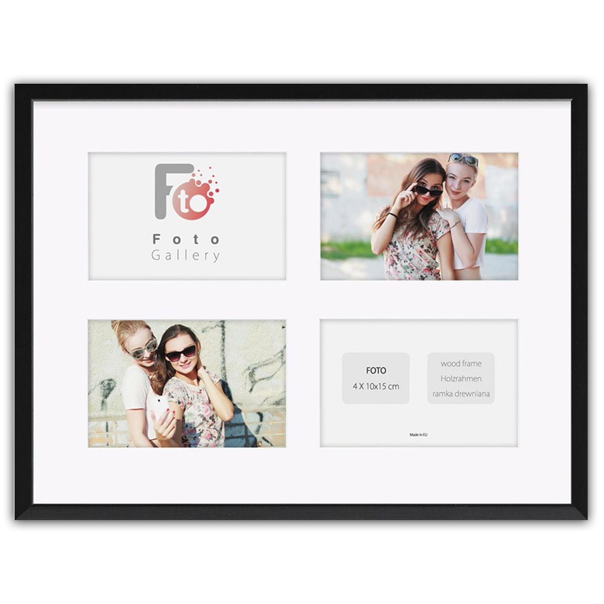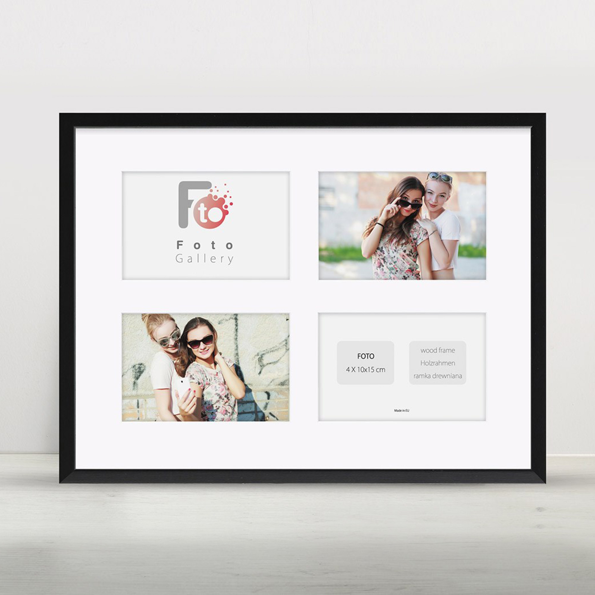 Nowoczesna, prosta w formie w 100% drewniana foto galeria w czarnym kolorze o przekroju profilu ramy 20x13 mm. Doskonała propozycja do oprawy kilku zdjęć w jednej ramie. Foto galeria wyposażona jest w jasne passe partout które pozwala na umieszczenie 4 fotografii w rozmiarze 10x15. Ramka drewniana wykonana jest z drewna sosnowego lakierowana w czarnym kolorze. Foto galeria Black 30x40 A dostępna jest również w innych kolorach: białym, czarnym i naturalnym.