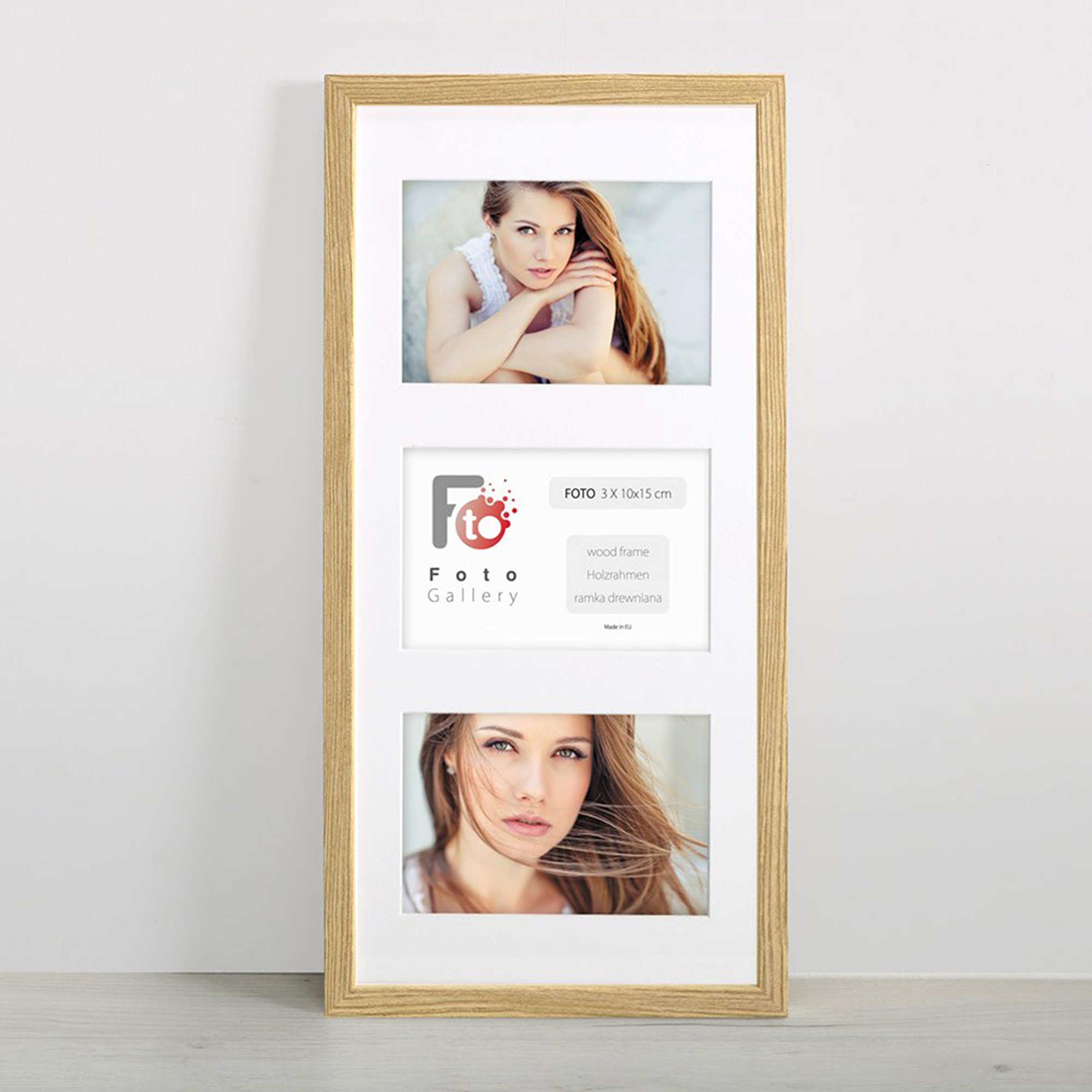 Nowoczesna, prosta w formie w 100% drewniana foto galeria w kolorze naturalnego drewna o przekroju profilu ramy 20x13 mm. Doskonała propozycja do oprawy kilku zdjęć w jednej ramie. Foto galeria wyposażona jest w jasne passe partout które pozwala na umieszczenie 3 fotografii w rozmiarze 10x15. Ramka drewniana wykonana jest z drewna sosnowego lakierowana w kolorze naturalnego drewna. Foto galeria Natural 20x42 dostępna jest również w innych kolorach: białym, czarnym i naturalnym.