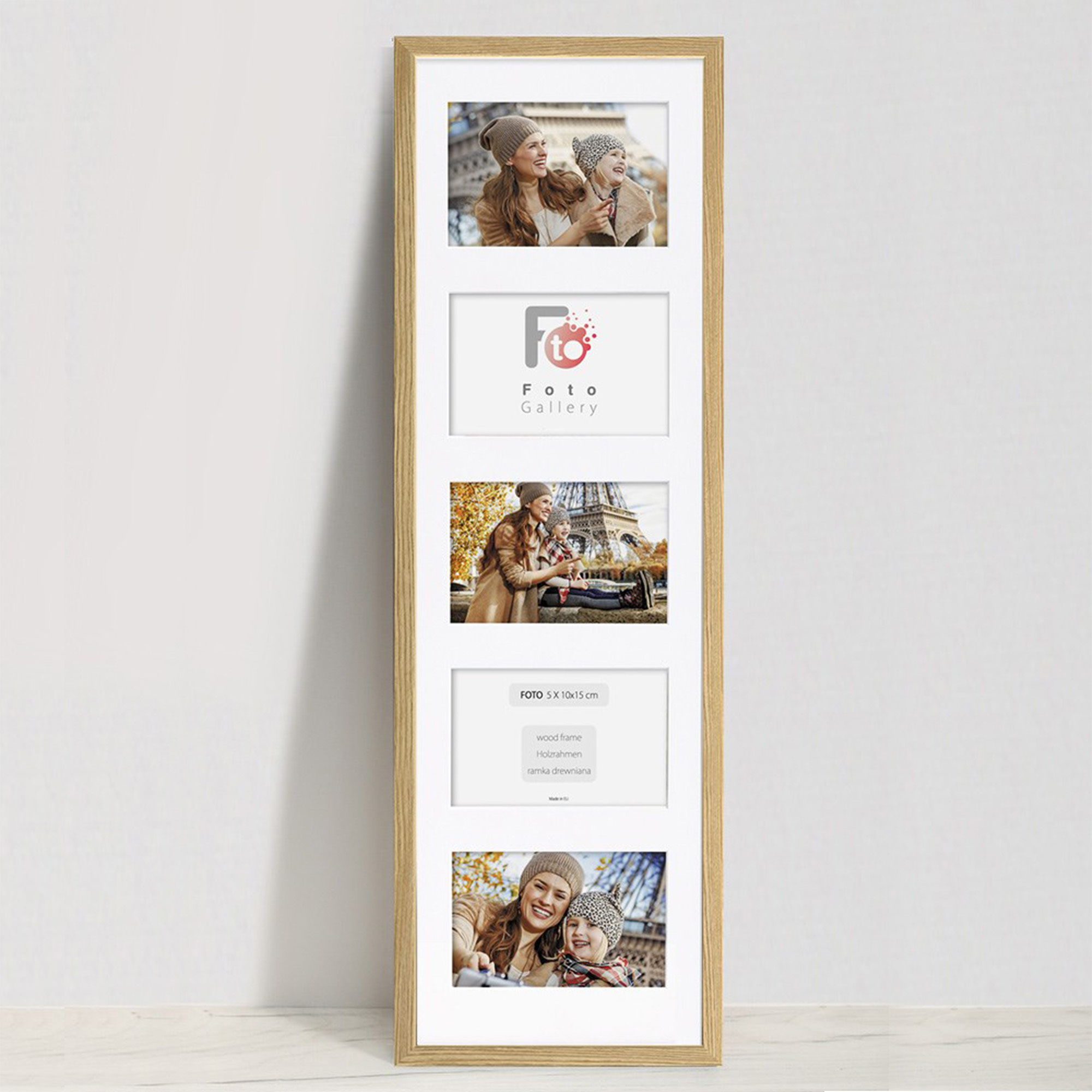 Nowoczesna, prosta w formie w 100% drewniana foto galeria w kolorze naturalnego drewna o przekroju profilu ramy 20x13 mm. Doskonała propozycja do oprawy kilku zdjęć w jednej ramie. Foto galeria wyposażona jest w jasne passe partout które pozwala na umieszczenie 5 fotografii w rozmiarze 10x15. Ramka drewniana wykonana jest z drewna sosnowego lakierowana w kolorze naturalnego drewna. Foto galeria Natural 20x68 dostępna jest również w innych kolorach: białym, czarnym i naturalnym.