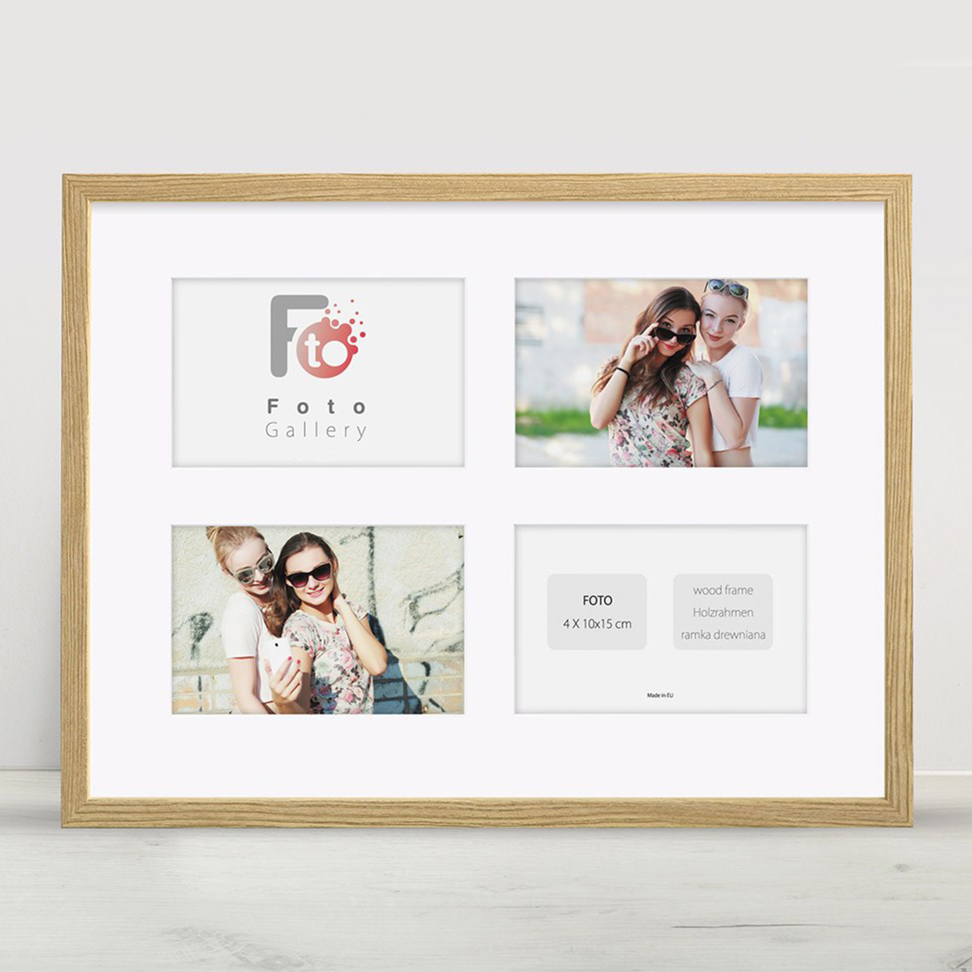 Nowoczesna, prosta w formie w 100% drewniana foto galeria w kolorze naturalnego drewna o przekroju profilu ramy 20x13 mm. Doskonała propozycja do oprawy kilku zdjęć w jednej ramie. Foto galeria wyposażona jest w jasne passe partout które pozwala na umieszczenie 4 fotografii w rozmiarze 10x15. Ramka drewniana wykonana jest z drewna sosnowego lakierowana w kolorze naturalnego drewna. Foto galeria Natural 30x40 A dostępna jest również w innych kolorach: białym, czarnym i naturalnym.