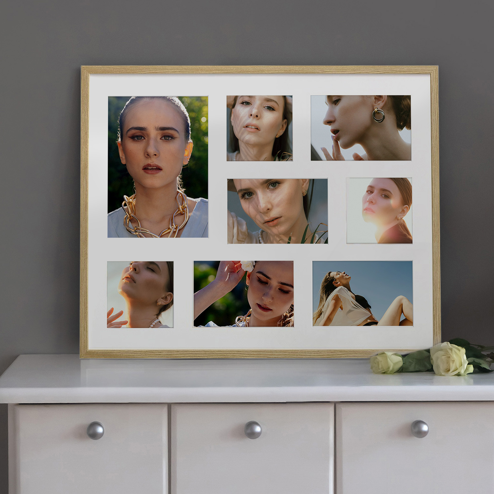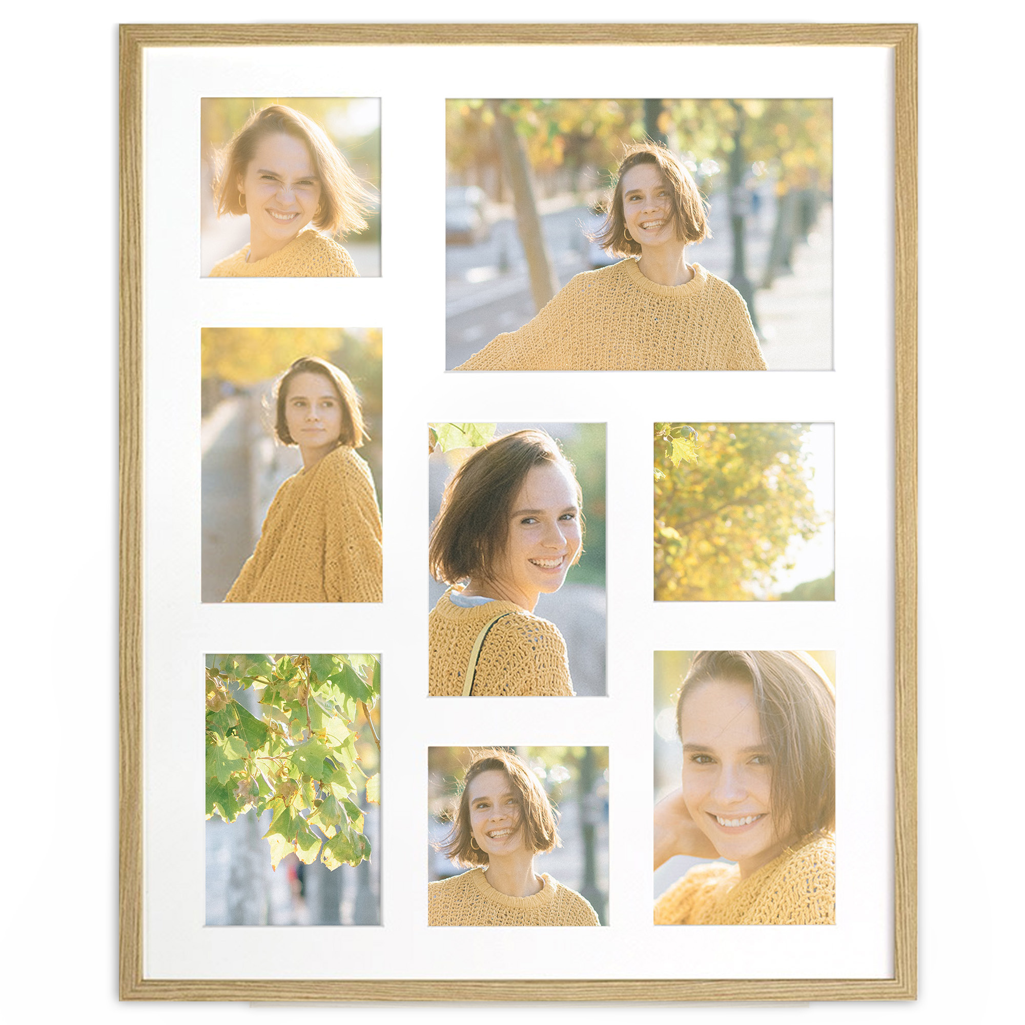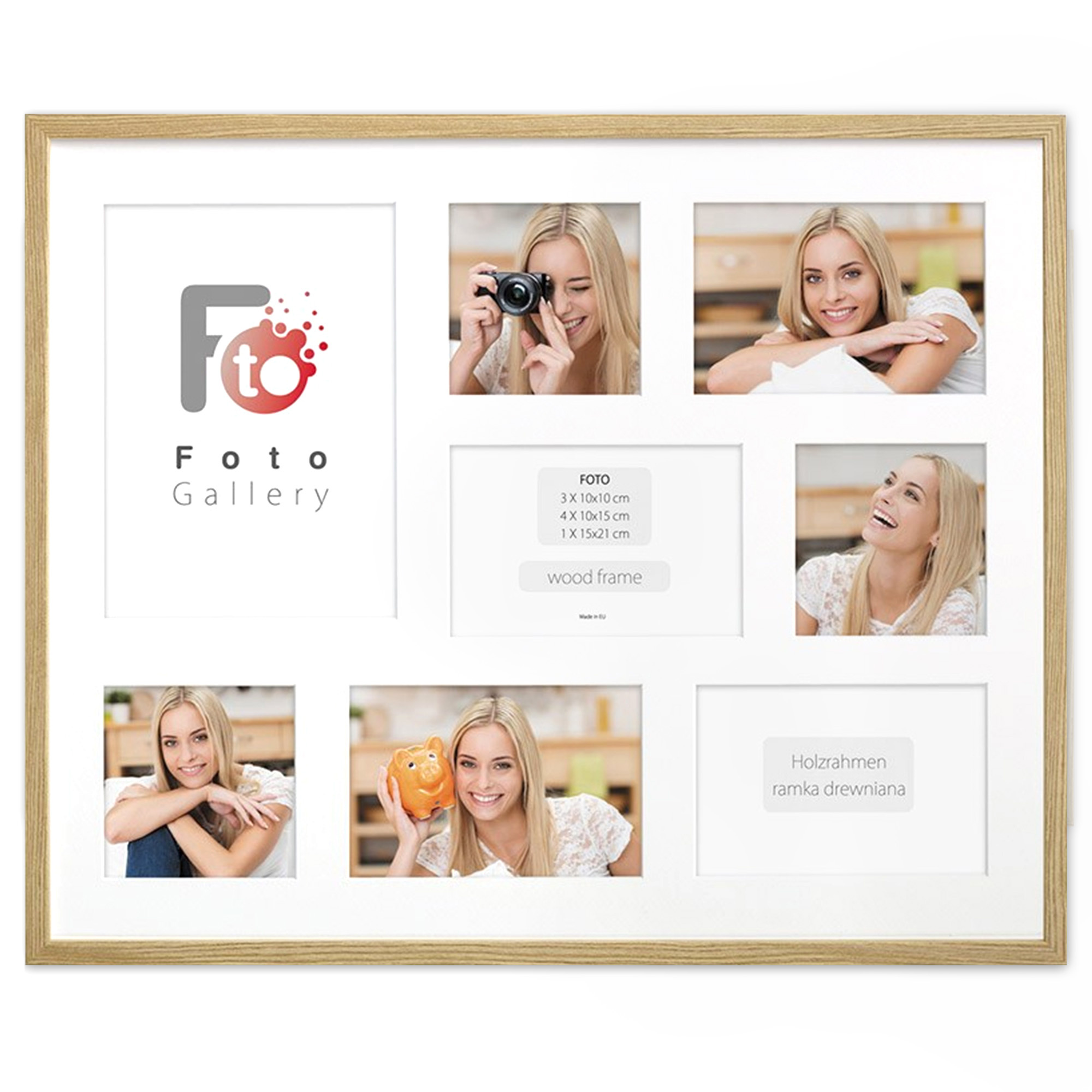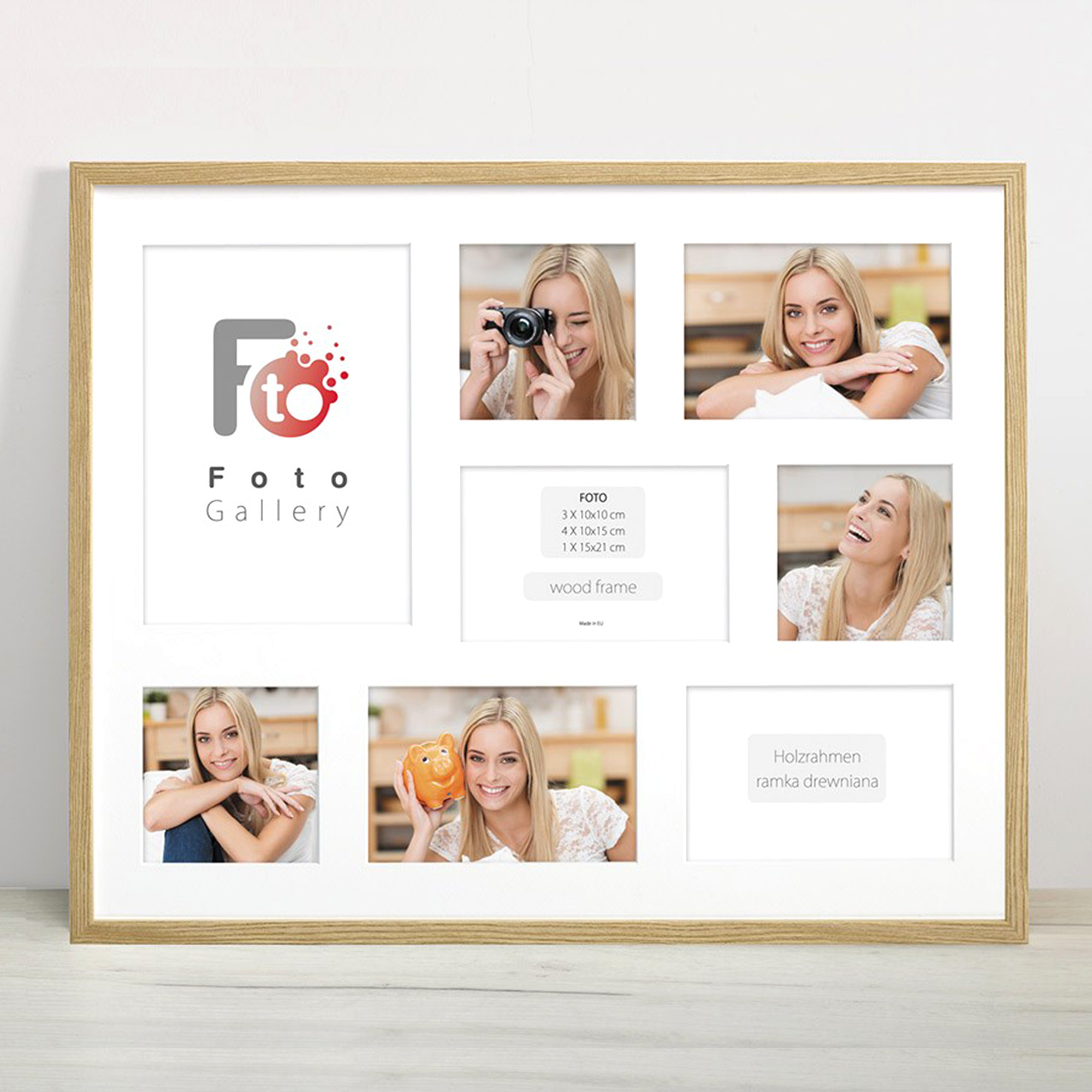 Nowoczesna, prosta w formie w 100% drewniana foto galeria w kolorze naturalnego drewna o przekroju profilu ramy 20x13 mm. Doskonała propozycja do oprawy kilku zdjęć w jednej ramie. Foto galeria wyposażona jest w jasne passe partout które pozwala na umieszczenie 8 fotografii w rozmiarze 1 x 15x21, 3 x 10x10, 4 x 10x15. Ramka drewniana wykonana jest z drewna sosnowego lakierowana w kolorze naturalnego drewna. Foto galeria Natural 40x50 C dostępna jest również w innych kolorach: białym, czarnym i naturalnym.