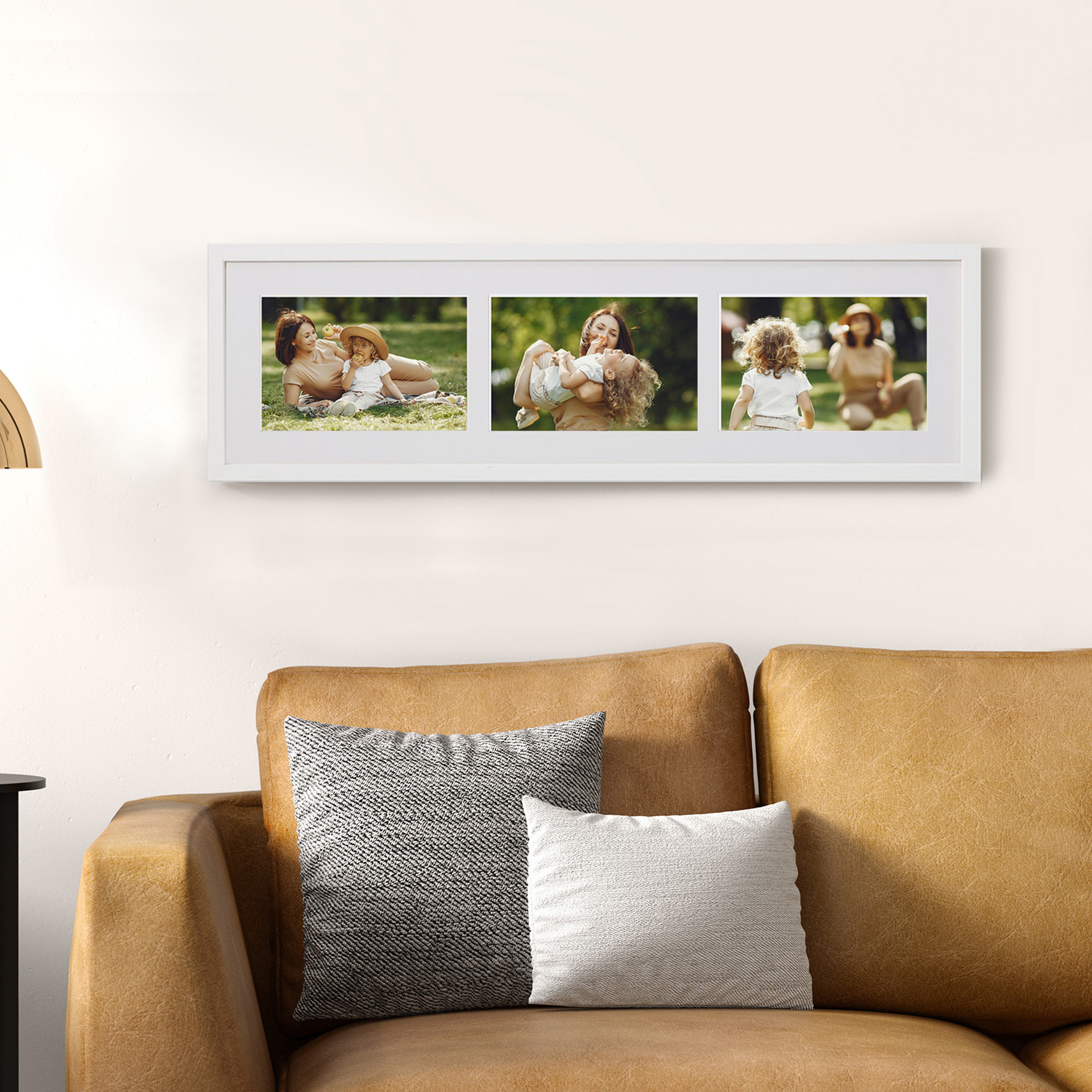 Nowoczesna, prosta w formie w 100% drewniana foto galeria w białym kolorze o przekroju profilu ramy 20x13 mm. Doskonała propozycja do oprawy kilku zdjęć w jednej ramie. Foto galeria wyposażona jest w jasne passe partout które pozwala na umieszczenie 3 fotografii w rozmiarze 10x15. Ramka drewniana wykonana jest z drewna sosnowego lakierowana w białym kolorze. Foto galeria White 15x52 dostępna jest również w innych kolorach: białym, czarnym i naturalnym.
