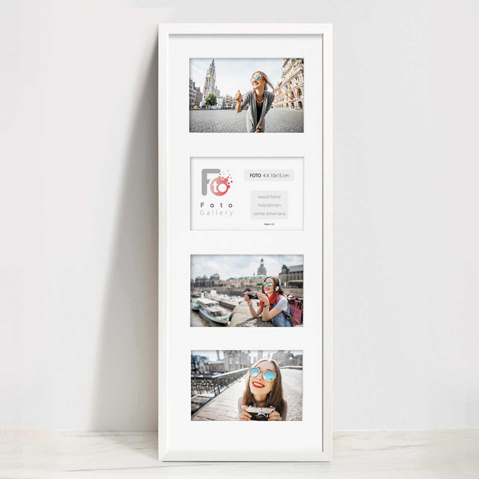 Nowoczesna, prosta w formie w 100% drewniana foto galeria w białym kolorze o przekroju profilu ramy 20x13 mm. Doskonała propozycja do oprawy kilku zdjęć w jednej ramie. Foto galeria wyposażona jest w jasne passe partout które pozwala na umieszczenie 4 fotografii w rozmiarze 10x15. Ramka drewniana wykonana jest z drewna sosnowego lakierowana w białym kolorze. Foto galeria White 20x55 dostępna jest również w innych kolorach: białym, czarnym i naturalnym.